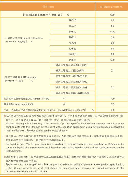 2009年11月15日,《玩具用涂料中有害物質限量強制標準》(GB24613-2009)正式發布,并將于2010年10月1日開始實施。本標準適用于各類玩具用涂料,即涂覆在玩具表面能形成涂膜的液體或固體涂料,其中規定了玩具用涂料中對人體和環境有危害物質的容許限量、測試方法、檢驗規則、包裝標示等內容,本標準將成為玩具用涂料之安全與環保性能符合性的判定依據,其中有關有害物質限量要求具體見下表。