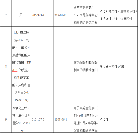 9項評議物質清單請見:https://echa.europa.eu/-/public-consultation-to-identify-nine-new-substances-of-very-high-concern