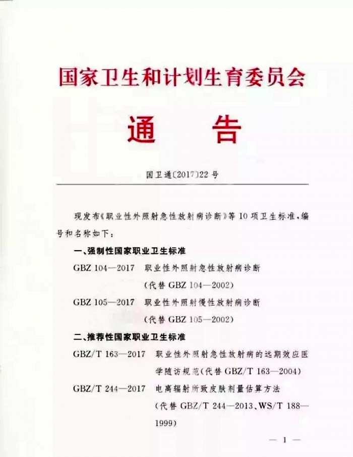 近日,國家衛計委發布通告發布了《職業性外照射急性放射病診斷》等10項衛生標準。