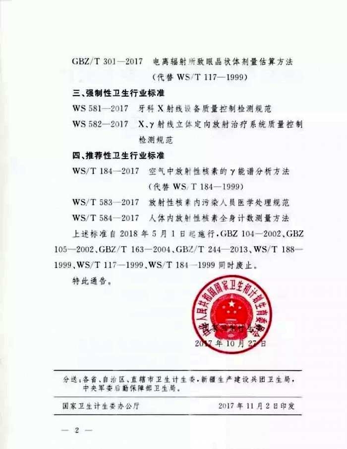 以上的標準將于2018年5月1日起施行,GBZ104-2002、GBZ105-2002、GBZ/T163-2004、GBZ/T 244-2013、WS/T 188-1999、WS/T 117-1999、WS/T 184-1999同時廢止。