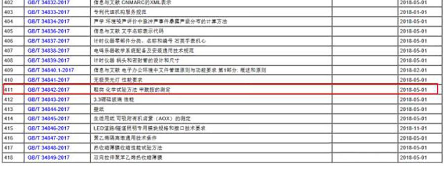 2017年11月1日,國家質檢總局、國家標準委發布了2017年第29號公告,批準發布了585項國家標準和2項國家標準修改單。其中,GB/T 34842-2017《鞋類 化學試驗方法甲酰胺的測定》標準位列其中(第411號),該標準即將于2018年5月1日實施。
