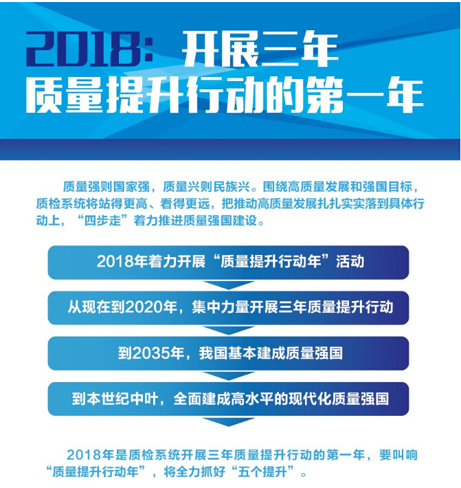 從全國質檢工作會議上獲悉:2018年,國家質檢總局將著力開展“質量提升行動年”活動,從增加農產品、食品藥品優質供給,促進消費品提質升級,提升裝備制造競爭力,提升原材料供給水平,提升建設工程質量水平,推動服務業提質增效,提升社會治理和公共服務水平,加快對外貿易優化升級等8個方面,集中力量開展3年質量提升行動。