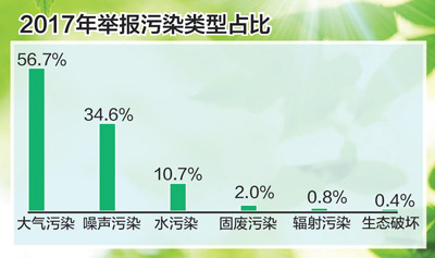 大氣污染方面,反映惡臭和異味污染最多,占涉氣舉報的30.6%,其次為反映煙粉塵及工業廢氣污染,分別占涉氣舉報的26.0%和21.7%;噪聲污染方面,反映建設施工和工業噪聲分別占噪聲舉報的49.0%、26.6%;水污染方面,反映工業廢水污染的占涉水舉報的51.1%。