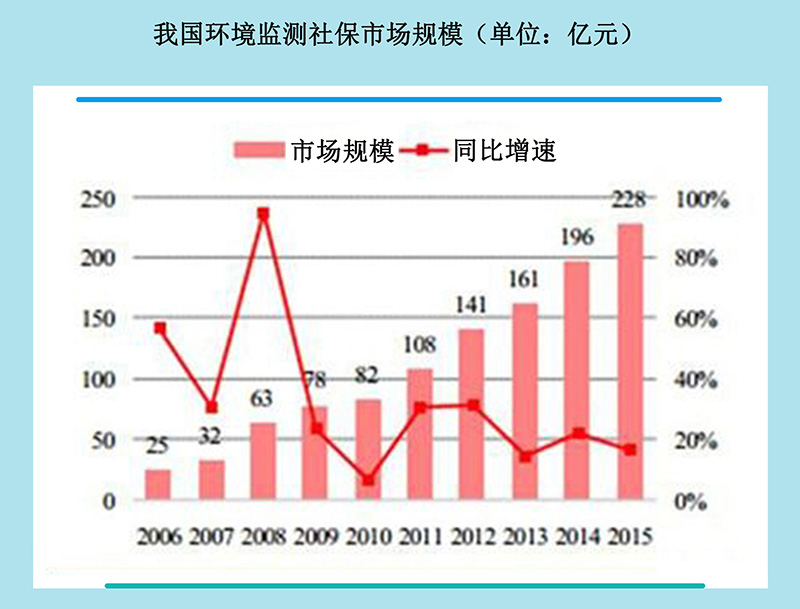 預期在“十三五”期間,行業保持25%的增速,到2020年,環境監測行業的市場規模將達到740億元,每年新增的市場規模為90億元。