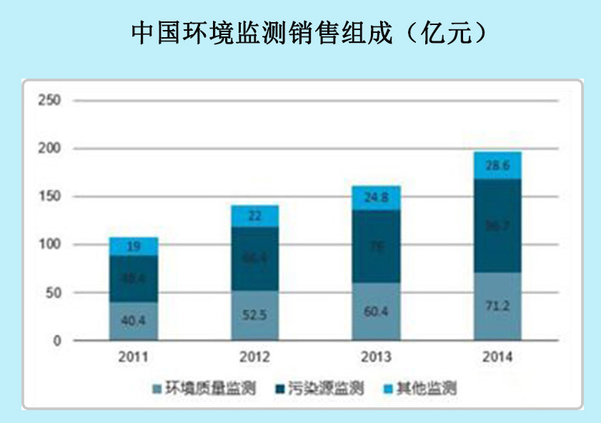 目前,我國環境監測行業市場集中度較高。由于環境監測技術門檻偏高,據不完全統計,國內從事環境監測的企業僅有200多家,大部分企業從事廢氣、廢水、環境空氣、地表水等在線自動監測系統的研制、生產、安裝、運營(含集成商)。約有120家企業生產廢氣在線監測系統,約有80家企業生產廢水在線監測系統。其中,高端分析儀器主要被德國西門子、瑞士ABB、美國賽默飛世爾等外資企業占領,內資企業主要參與中低端分析儀器市場,大部分企業從事廢氣、廢水、環境空氣、地表水等在線自動監測系統的研制、生產、安裝、運營(含集成商)。其中,約有120家企業生產廢氣在線監測系統,約有80家企業生產廢水在線監測系統。環境監測儀器行業的銷售收入逐年增加,由2005年的15.84億元上升為2014年的196.44億元。
