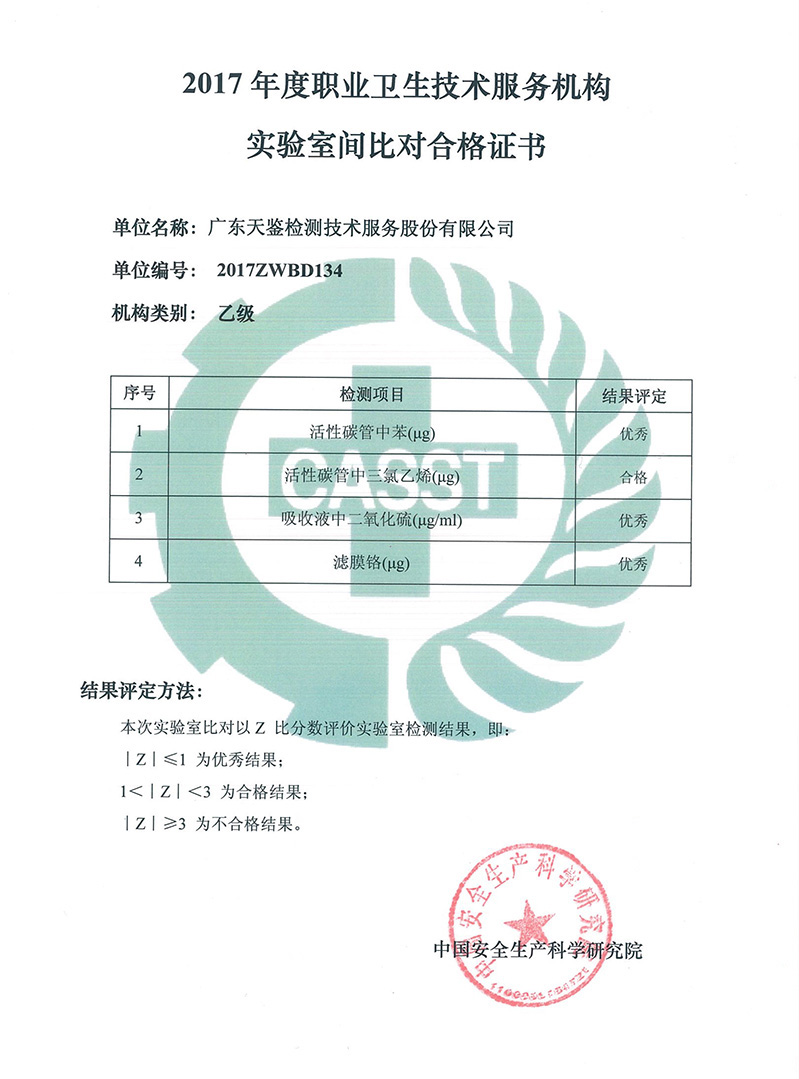 天鑒檢測在全國性的2017年度職業衛生機構實驗室間對比取得合格成績