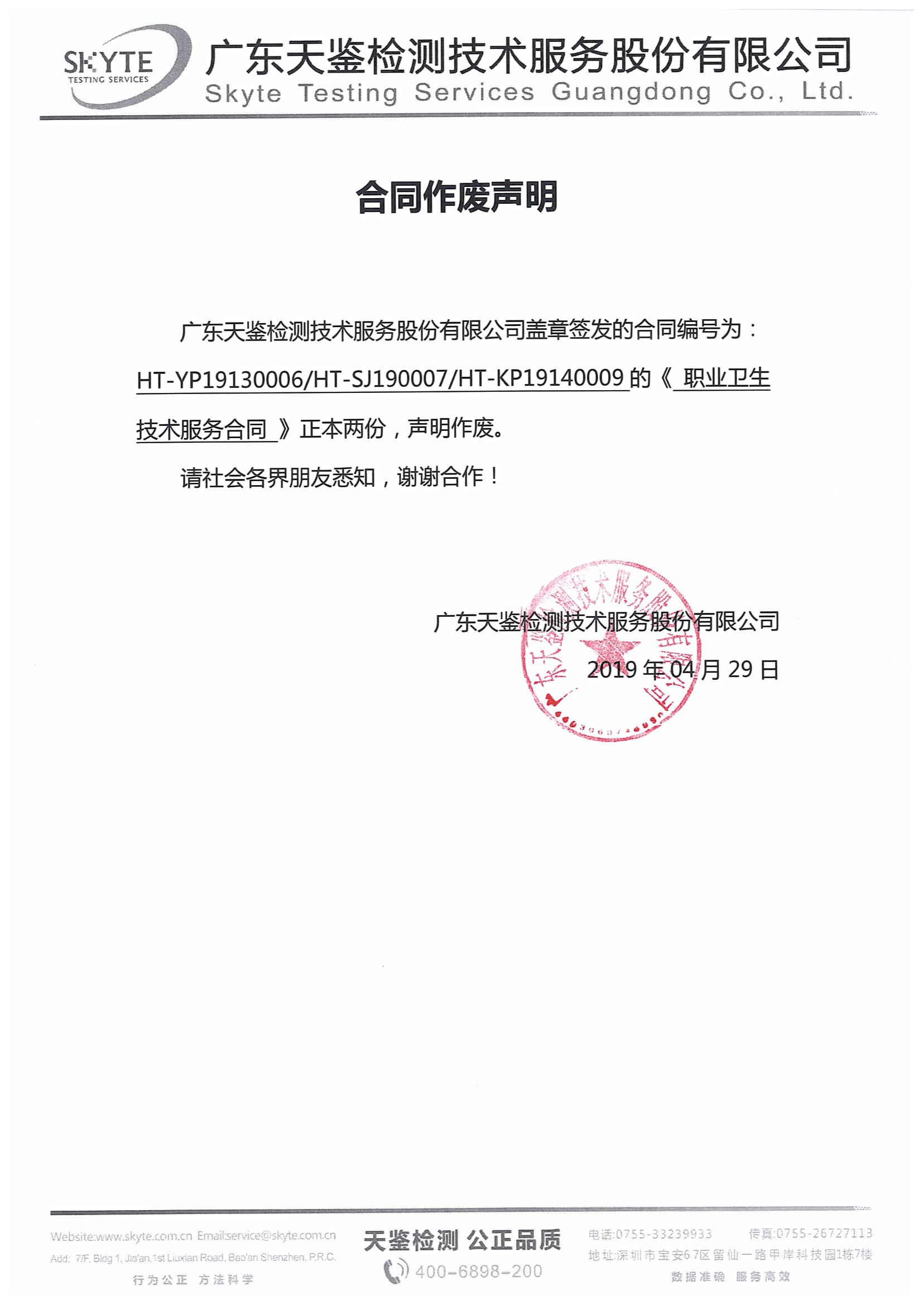 廣東省天鑒檢測技術服務有限公司蓋章簽發的合同編號為:HT-YP19130006/HT-SJ190007/HT-KP19140009的《職業衛生技術服務合同》正本兩份,聲明作廢。特此公告,望周知!