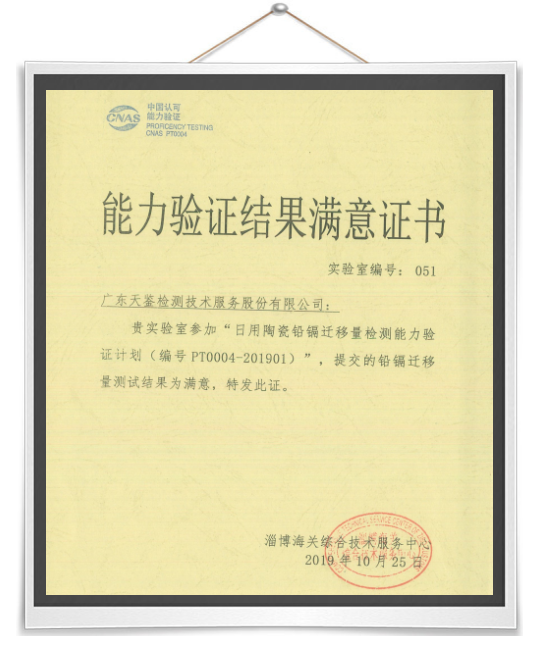天鑒檢測參加的淄博海關綜合技術服務中心組織的“日用陶瓷鉛鎘遷移量檢測”能力驗證項目,結果為“滿意”,再次證明了天鑒檢測在產品檢測領域的實力。