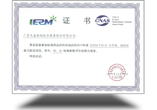 天鑒檢測參加的環境保護部標準樣品研究所組織的編號為“IERM T19-21水中鐵,錳檢測”能力驗證項目,結果為“滿意”,再次證明了天鑒檢測在環境檢測領域的實力。