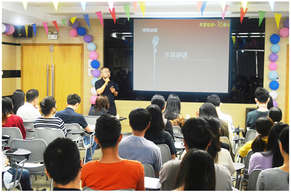 涂總首先向十六年來,為公司發展作出貢獻的每一位員工表示衷心的感謝,同時也感恩自己及公司遇上了改革開放帶來的機遇,沒有改革開放可能就不會有天鑒檢測,更不會有天鑒檢測的今天。涂總總結了十六年來公司發展的一些得失,指出了當前公司存在且需要解決的一些問題。面向未來,公司將不斷總結經驗,創新思維,在鞏固現有業務領域下,積極拓展新的市場與業務,以十六周年為新的起點,開啟第三次“創業”。涂總寄語全體員工,堅定信念,不怕困難,團結一致,奮力拼搏,向著新的更高的目標奮勇前進!