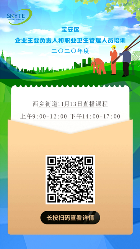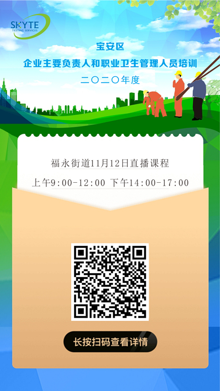 為宣傳貫徹《職業病防治法》,保護勞動者健康權益,提升用人單位職業病防治意識,幫扶企業健康發展,2020年11月,深圳市寶安區衛生監督所委托第三方機構廣東天鑒檢測技術服務股份有限公司為寶安區企業提供企業主要負責人和職業衛生管理人員培訓 ,預計將培訓上千家企業,兩千余企業管理人員。
