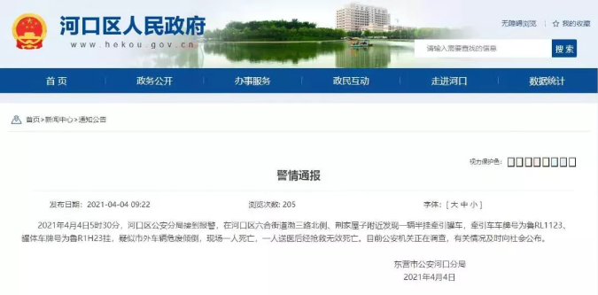 2021年4月4日5時30分,河口區公安分局接到報警,在河口區六合街道渤三路北側、荊家屋子附近發現一輛半掛牽引罐車,牽引車車牌號為魯RL1123、罐體車牌號為魯R1H23掛,疑似市外車輛危廢傾倒,現場一人死亡,一人送醫后經搶救無效死亡。目前公安機關正在調查,有關情況及時向社會公布。