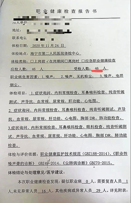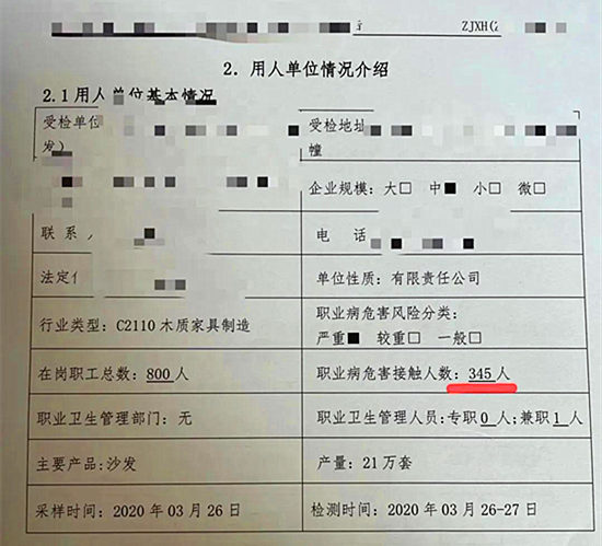 近日,海寧市衛生監督所在開展本年度職業衛生用人單位雙隨機執法檢查時,發現一家具制造企業存在噪聲、粉塵等多種危害因素。執法人員現場查看了該企業出示的《工作場所職業病危害因素檢測報告》,根據報告顯示,該企業職業病危害的接觸人數為345人,而現場能出示的《職業健康檢查報告書》顯示2020年以來接受過職業健康檢查的勞動者只有46人,且從未開展過上崗前職業健康檢查!