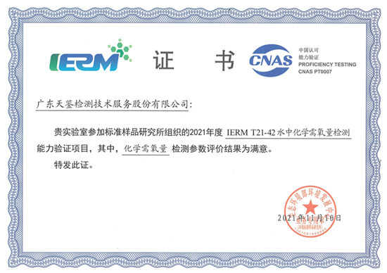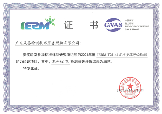近日,我司參加生態環境部環境發展中心組織的2021年度“IERM-T21-42水中化學需氧量和IERM T21-44 水中多環芳烴(苯并【a】芘)”檢測,兩項結果均為“滿意",再次證明了我司在環境檢測領域的實力。