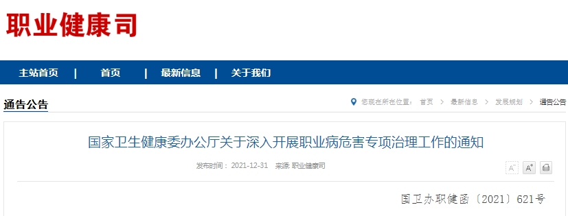 近日,國家衛生健康委發布《關于深入開展職業病危害專項治理工作的通知》,決定自2022年1月起至2025年12月在全國范圍內開展職業病危害專項治理工作。