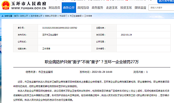 近日從浙江省玉環市政府網站獲悉,玉環市衛生監督所執法人員在浙江省職業病危害項目申報系統上查看企業申報情況,發現一企業職業病危害因素檢測、職業健康體檢、職業病危害項目申報均已完成,但職業病危害因素檢測報告卻顯示矽塵濃度超標。