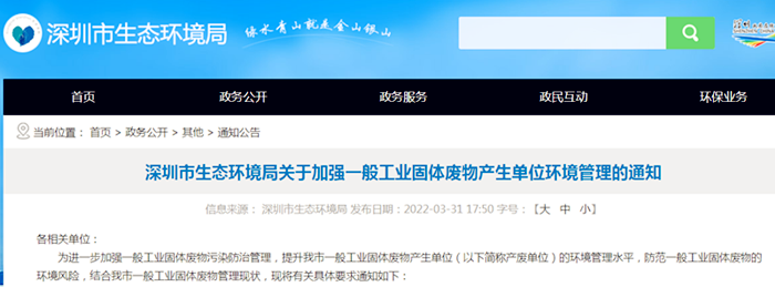 近日從深圳市生態環境廳網站獲悉,為進一步加強一般工業固體廢物污染防治管理,提升深圳一般工業固體廢物產生單位的環境管理水平,防范一般工業固體廢物的環境風險,結合深圳一般工業固體廢物管理現狀,有關具體要求的通知如下: