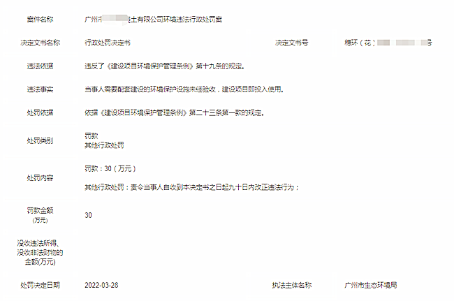 近日從廣州市生態環境局網站獲悉,廣州市**混凝土有限公司新增了一條行政處罰信息,因該公司配套建設的環境保護設施未經驗收,建設項目投入使用,被罰30萬元。