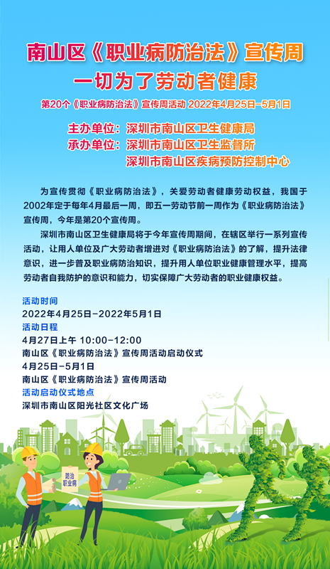 為宣傳貫徹《職業病防治法》,保障勞動者健康權益,我國定于每年五一勞動節前一周作為《職業病防治法》宣傳周,今年是第20個宣傳周。由深圳市南山區衛生健康局主辦、南山區衛生監督所、南山區疾病預防控制中心承辦的深圳市南山區2022年《職業病防治法》宣傳周活動啟動儀式,將于2022年4月27日上午10點在南山區陽光社區文化廣場隆重舉行。