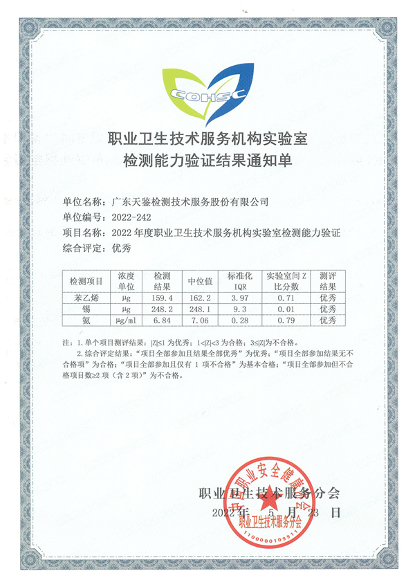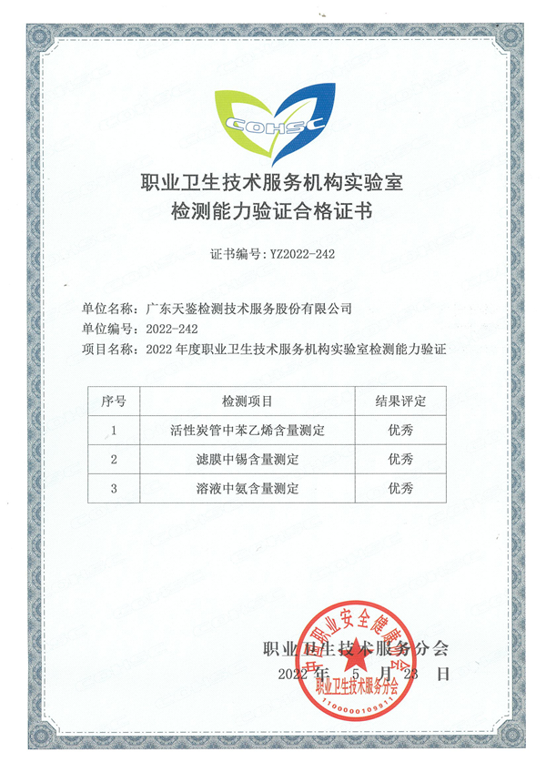 近日,天鑒檢測參加中國職業安全健康協會職業技術分會組織的“活性炭管中苯乙烯含量的測定”、“濾膜中錫含量的測定”、“溶液中氨含量的測定”三項能力驗證結果均為“優秀”,再次證明了我司在職業衛生領域的實力!