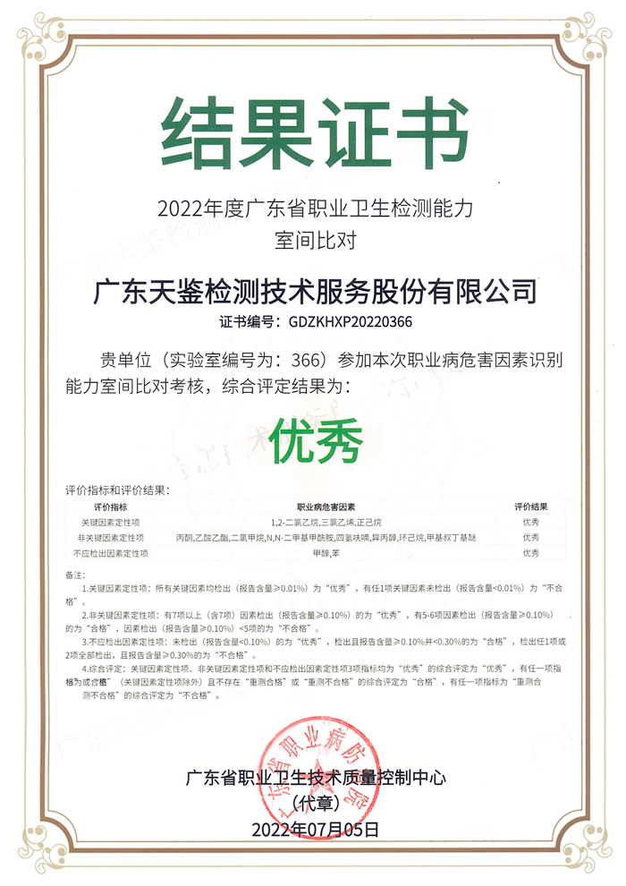 近日,我司參加“廣東省職業衛生技術質量控制中心”組織的“職業病危害因素識別能力”室間比對考核,三項驗證結果均為“優秀”,再次證明了我司在職業衛生領域的實力!