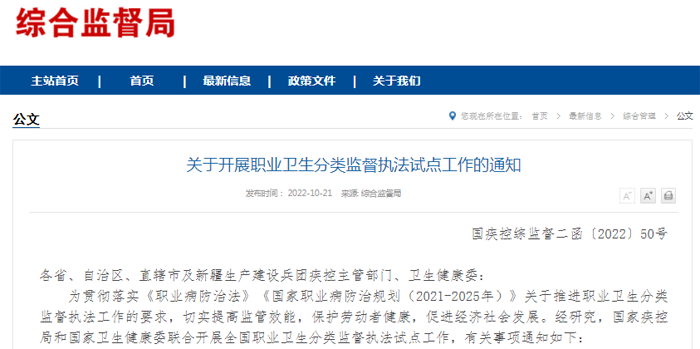 近日,國家衛生健康委和國家疾控局發布《關于開展職業衛生分類監督執法試點工作的通知》,通知指出,為貫徹落實《職業病防治法》《國家職業病防治規劃(2021-2025年)》中關于推進職業衛生分類監督執法工作的要求,國家衛健委和國家疾控局將于2022年11月1日至2024年10月31日,聯合開展為期2年的全國職業衛生分類監督執法試點工作。