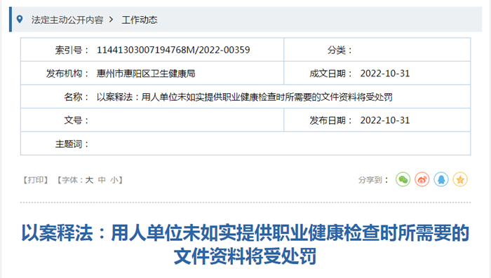 近日惠州市惠陽區衛生健康局網站消息,一公司在委托職業健康體檢機構對該公司接害作業崗位員工進行體檢時,僅提供了員工個人資料和職業健康檢查委托書,未向被委托的職業健康檢查機構提供作業場所職業病危害因素檢測、評價報告,依據《用人單位職業健康監護監督管理辦法》第二十六條第(四)項的規定,惠陽區衛生健康局作出給予該公司警告并罰款人民幣20000萬元的行政處罰。