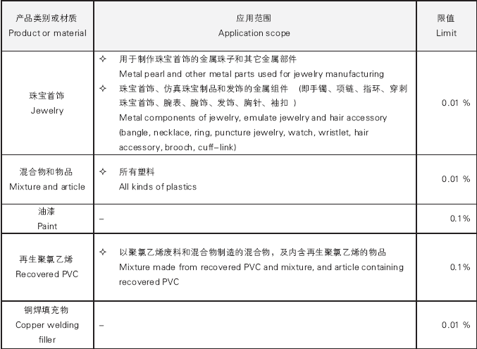 EU 494/2011出臺前,REACH附錄十七(Annex XVII) 已對混合物和物品的鎘含量施行數項限制。現在,限制范圍則延伸至珠寶首飾、銅焊條和所有塑料,把鎘含量限于0.01%的水平。對于循環再用的聚氯乙烯 (PVC) 物料于建筑產品的應用,新法規容許重復使用低鎘含量 (0.1%) 的再生聚氯乙烯 (recovered PVC)。修訂后的REACH附錄十七對鎘含量的限制更加明確和具體。