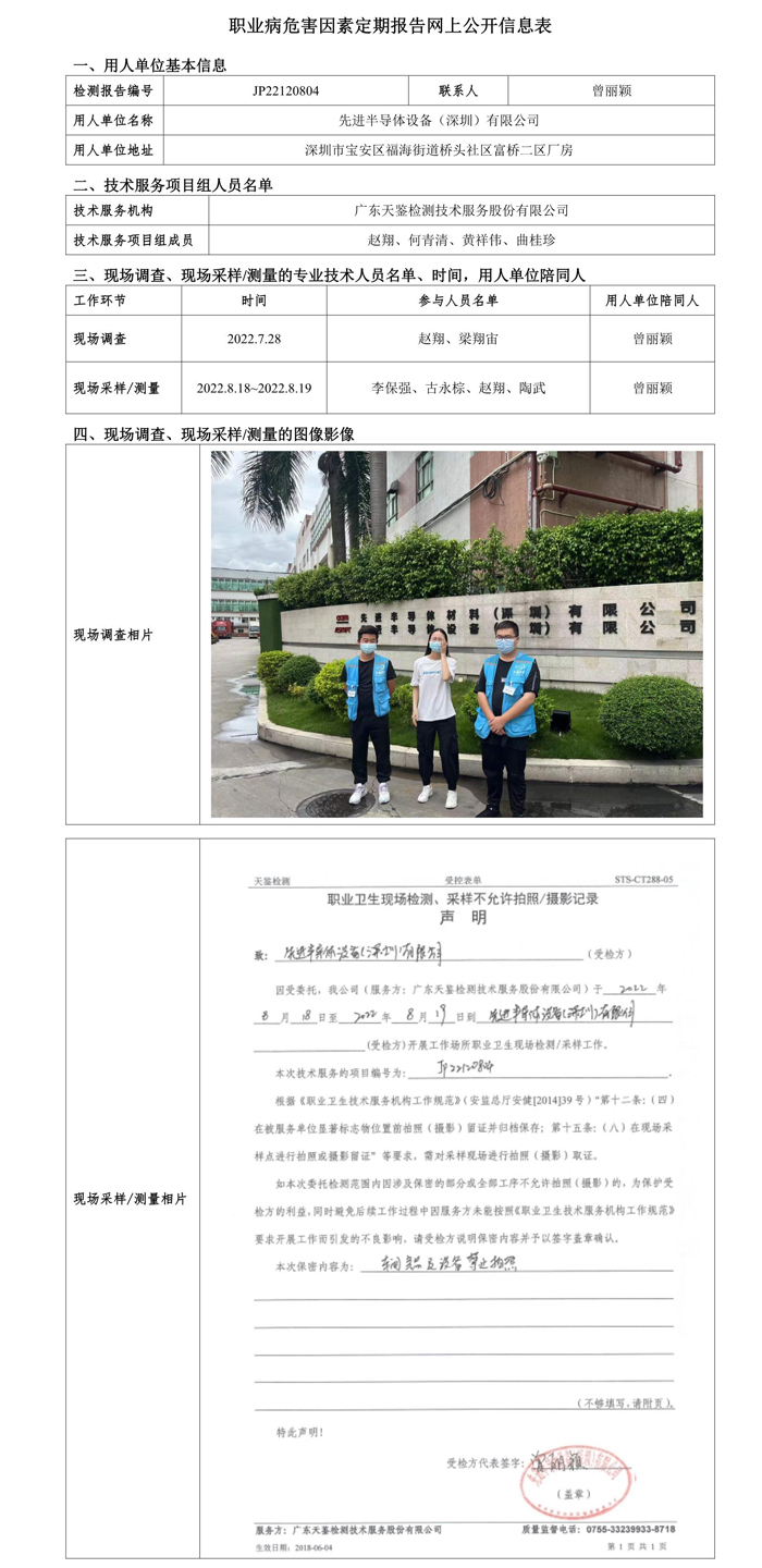 上一篇:JP22120803先進半導體設備(深圳)有限公司和平創鋒分廠職業病危害因素定期報告網上公開信息表