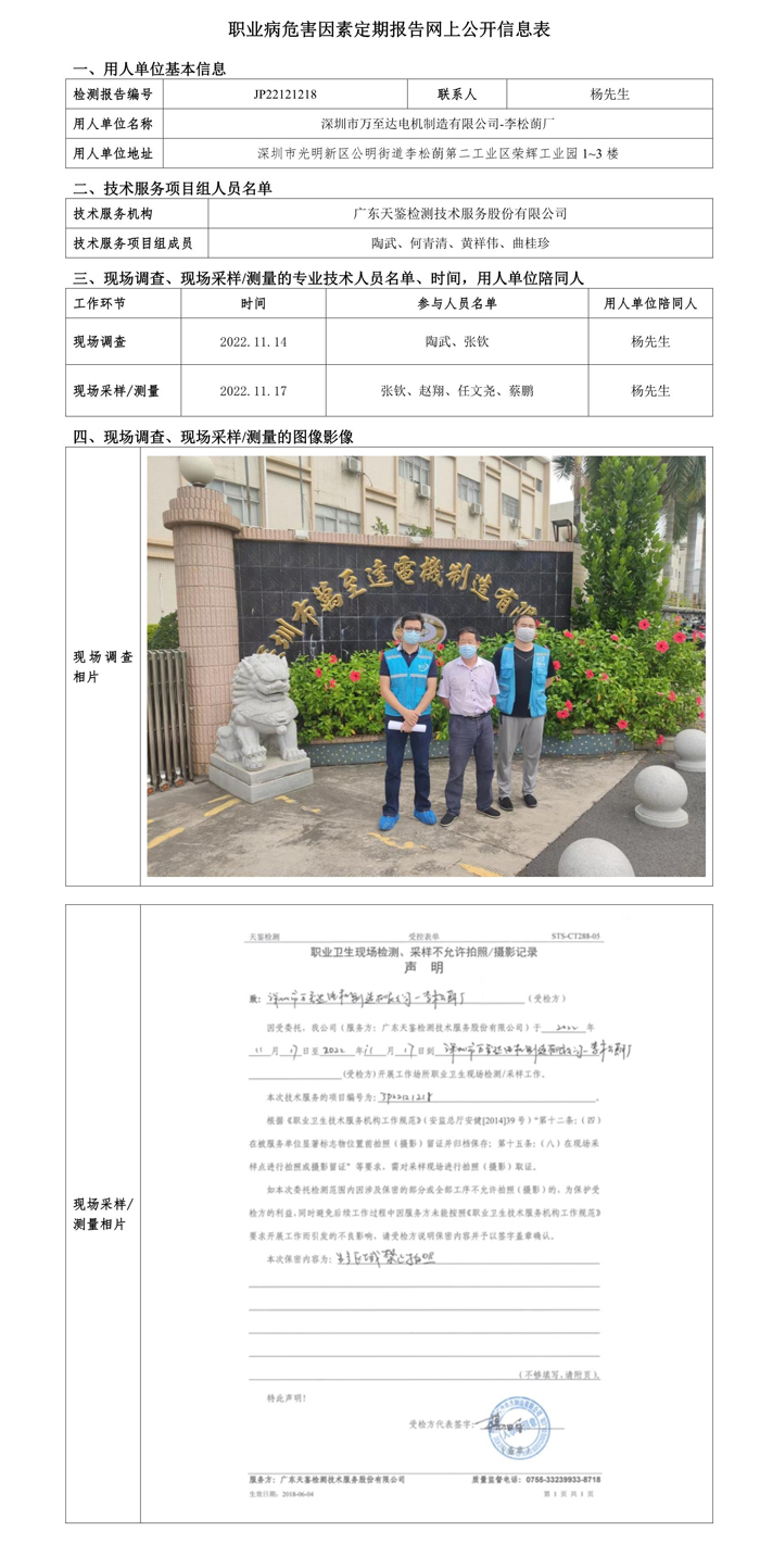 上一篇:JP22121217深圳市萬至達電機制造有限公司-馬山頭廠職業病危害因素定期報告網上公開信息表