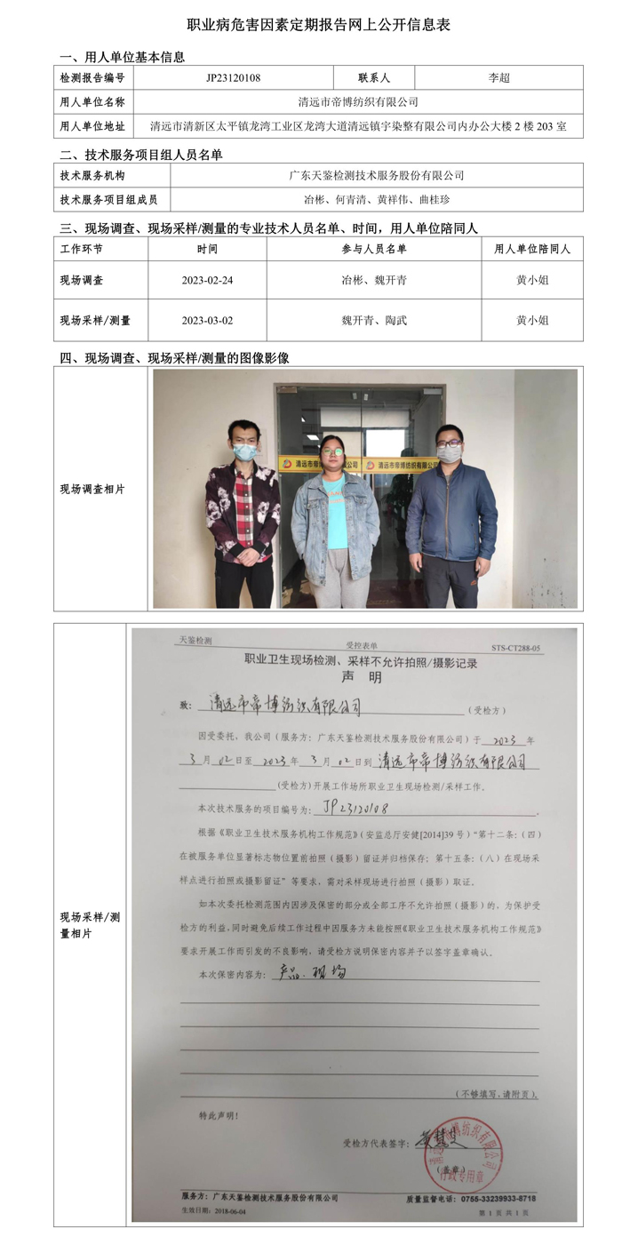 下一篇:JP23120109清遠市永貞紡織有限公司職業病危害因素定期報告網上公開信息表