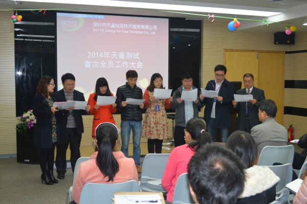“2014年將是天鑒檢測濃墨重彩的一年”,是的,2014年是馬年,天鑒人將揚鞭奮蹄,馬到成功!在今天上午,2月17日星期一,公司舉行全員工作動員大會,也可以說是誓師大會,以推動全體員工的工作熱情,為全年的工作開一個好頭。