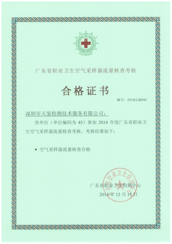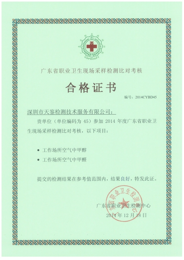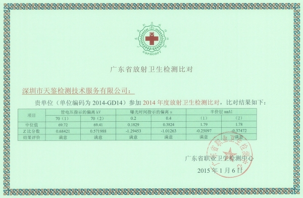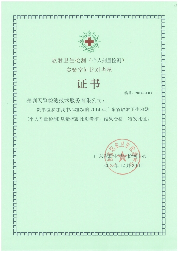 本周,由“廣東省職業衛生檢測中心”組織的2014年度職業衛生、放射衛生實驗室間能力比對成績揭曉,天鑒檢測參加的各項檢測項目及實操(含放射)均取得了滿意結果,并獲得合格證書。此次考核再一次檢驗了我司的職業衛生技術服務能力,再一次證明我司“行為公正、方法科學、數據準確、服務高效”質量方針的充分貫徹實施。