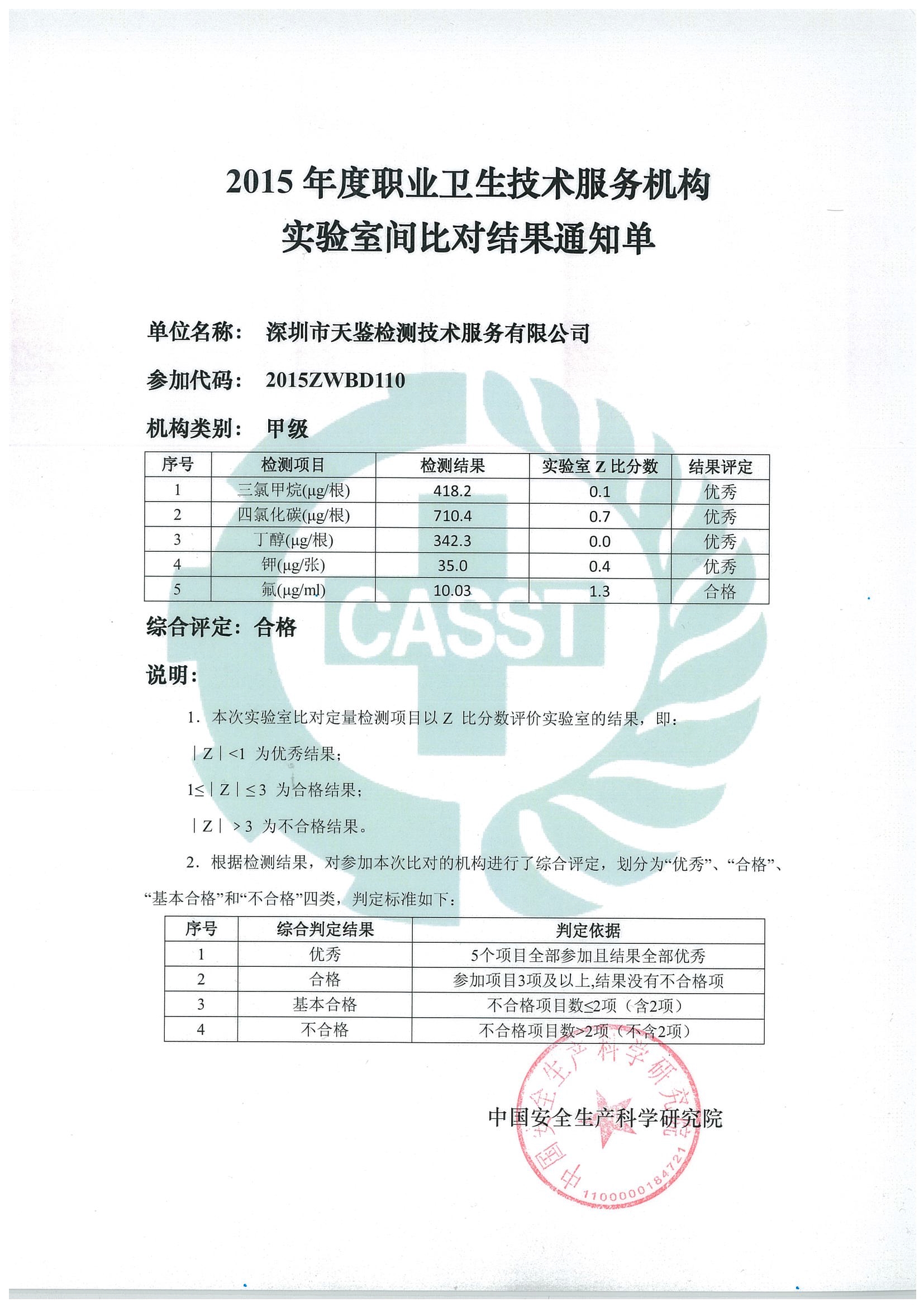 恭喜我公司在中國安全生產科學研究院舉辦的2015年度全國職業衛生檢測能力實驗室間比對中取得“合格”成績!其中檢測項目:三氯甲烷、四氯化碳、丁醇和鉀的檢測結果均為優秀,氟的檢測結果為合格!
