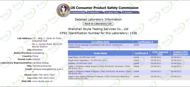 As the leader and the innovator in inspection, verification, testing and certification field in China, Skyte Testing Services Guangdong Co., Ltd.(SKYTE) is a branch testing institute found by a national chemical testing center (China National Analytical Center Guangzhou, NACC) in Shenzhen. It has been accredited by CNAS (L4549)、CMA(2010191807Z)and CPSC(1336).With the recognition of its certifications by ILAC-MRA